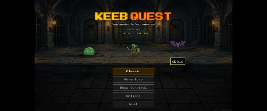Keeb Quest is a typing game where your keyboard is your weapon. Battle enemies, defeat bosses, and explore Choose Your Own Adventure stories — all while sharpening your typing skills. Multiple game modes, combos, and achievements keep every keypress counting.