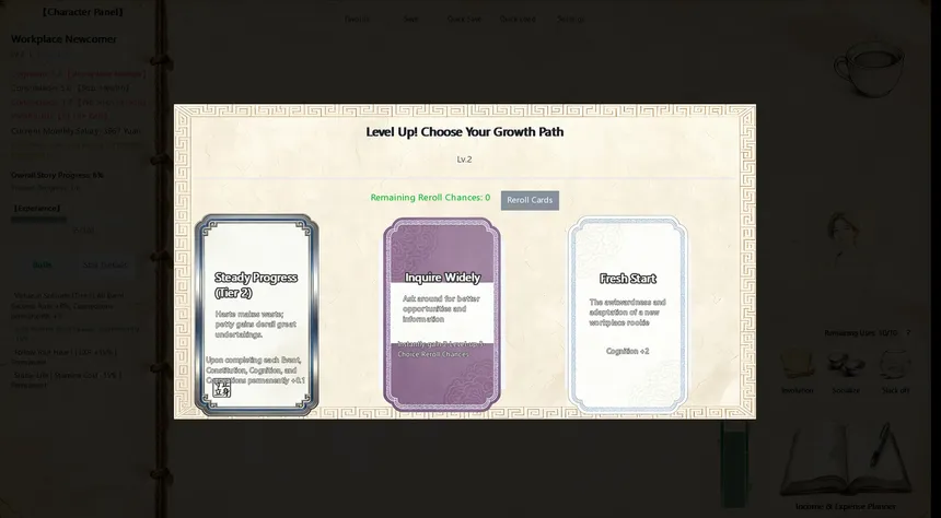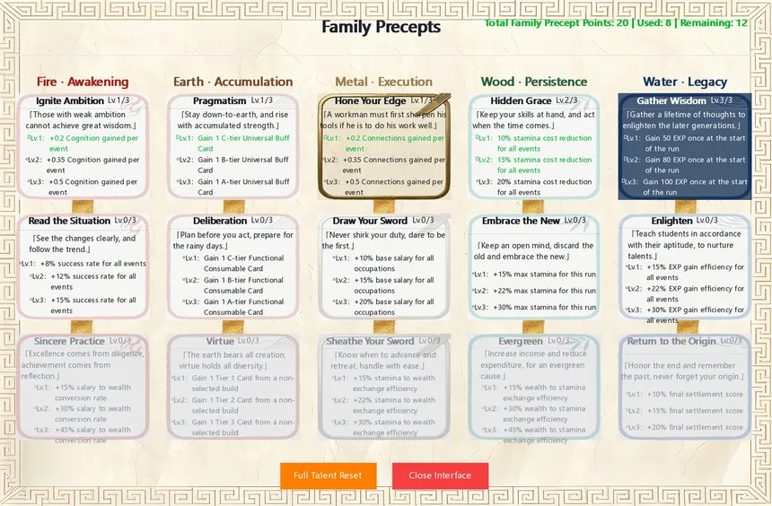 "Chinese Newcomer" blends deck-building with career simulation. Players choose one of three cards to collect, manage stamina. Use "Legacy Points" to grant Five-Elements talents to descendants, rectifying past regrets. Make choices along paths and embarking on a multi-generational journey.