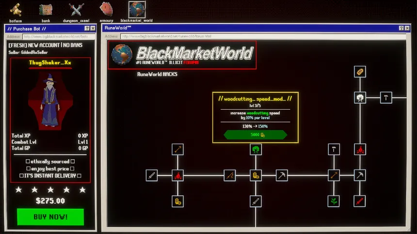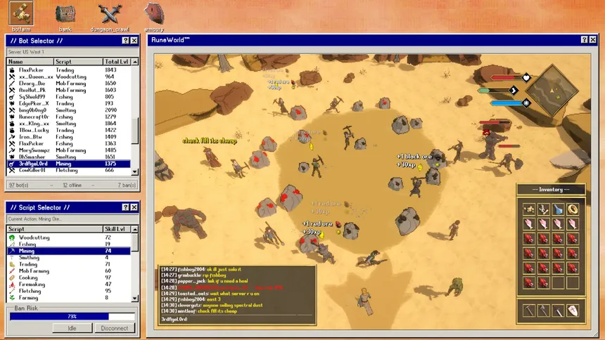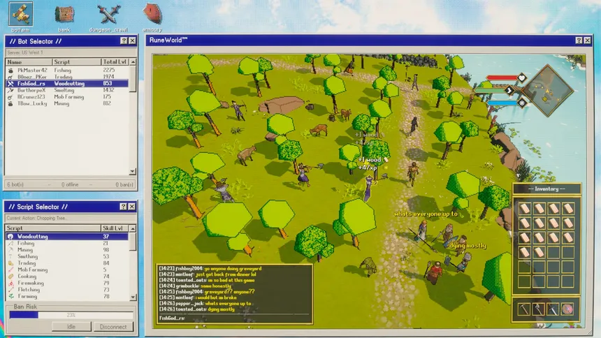 A game about running a botfarm on an oldschool MMO to gather and sell resources, level up your bots, and clear dungeons to find loot.