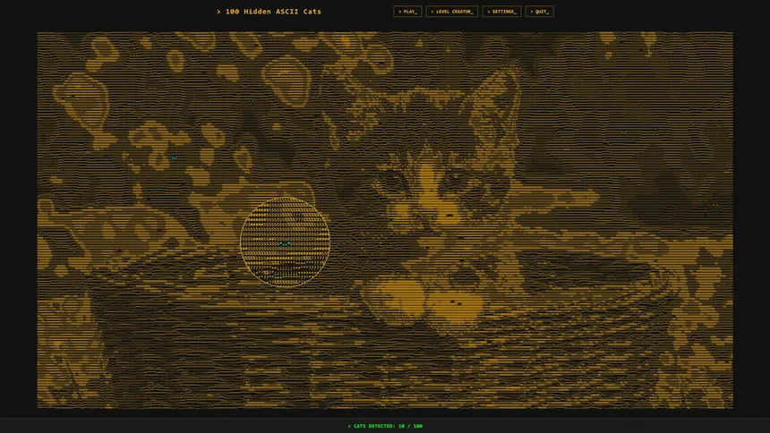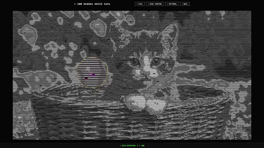 Уютный поиск предметов в огромных мирах, целиком нарисованных из ASCII-символов. Возьми лупу и найди 100 котят, спрятавшихся среди знаков.