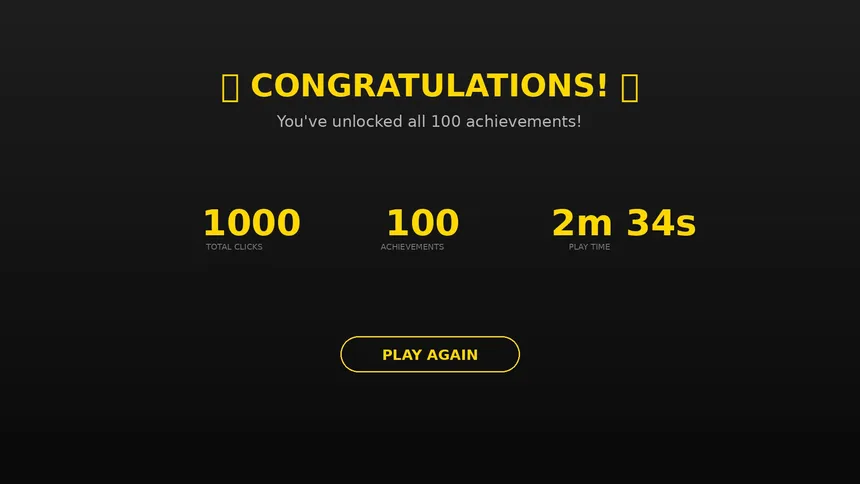 Click the golden triangle and unlock 100 achievements! Extreme Clicker is the perfect game for achievement hunters. Simple, addictive, and satisfying. Can you reach 1000 clicks and complete them all?
