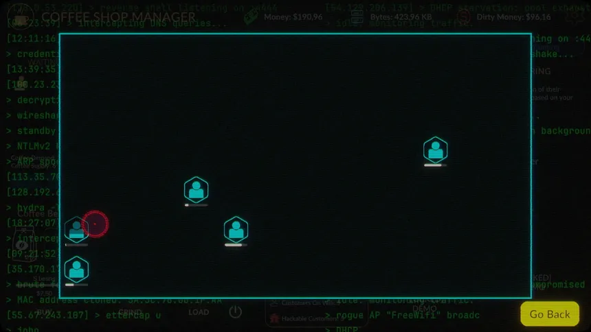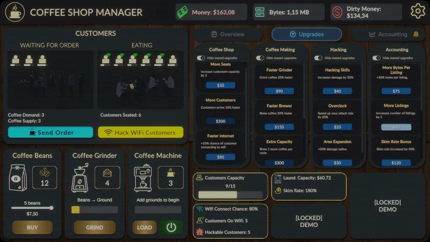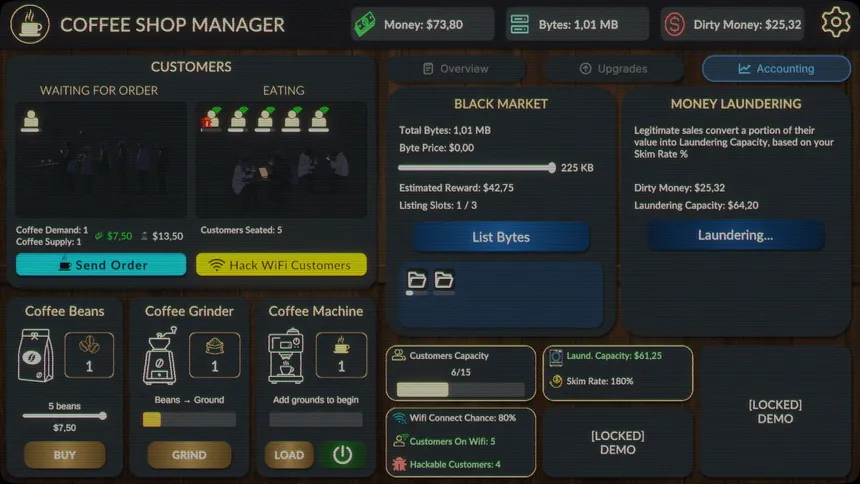An active incremental game where you own a coffee shop, but your hidden agenda is to hack your customers' devices, steal their data and sell it on the black market for some dirty money. Good thing you've got a coffee shop to launder it! Use your money to buy upgrades and grow your business.