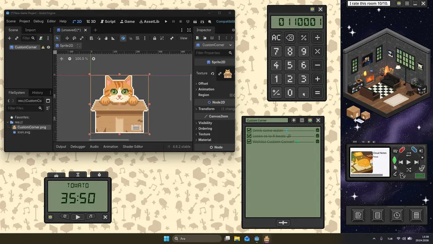 Custom Corner — уютный симулятор и инструмент фокуса, тихо работающий в углу экрана. Создайте изометрическую комнату из 200+ предметов и наслаждайтесь lo-fi музыкой. Повышайте продуктивность с помощью таких виджетов, как список дел и таймер, пока работаете или отдыхаете.