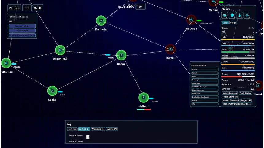 Wars are won by logistics. Command the Federation's fleets across a star system, manage supply chains, secure planets, and outmaneuver a relentless AI enemy. Every battle is decided before it begins.