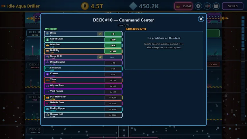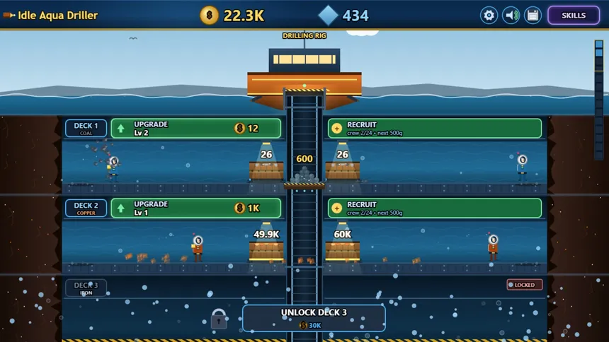 Погрузись в глубины океана в этой инкрементальной игре про подводную добычу! Управляй буровыми установками, нанимай водолазов и подлодки, открывай новые слои и ресурсы. Улучшай палубы, ускоряй добычу и развивай древо навыков, превращая станцию в мощный подводный комплекс.