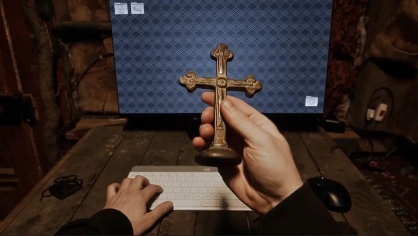 You are the night shift security at a ruined, isolated graveyard. Watch the black-and-white cameras and report any anomalies you see. But don't just stare at the monitors—if you feel a presence inside your cabin, turn around and raise your cross before it's too late.