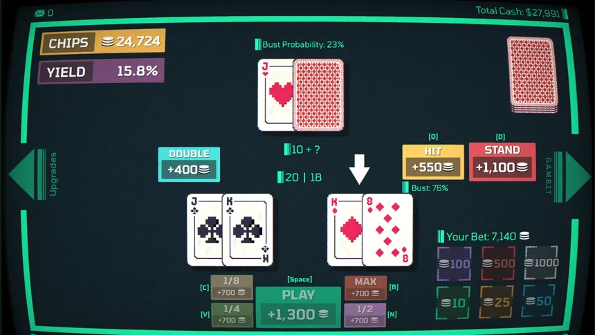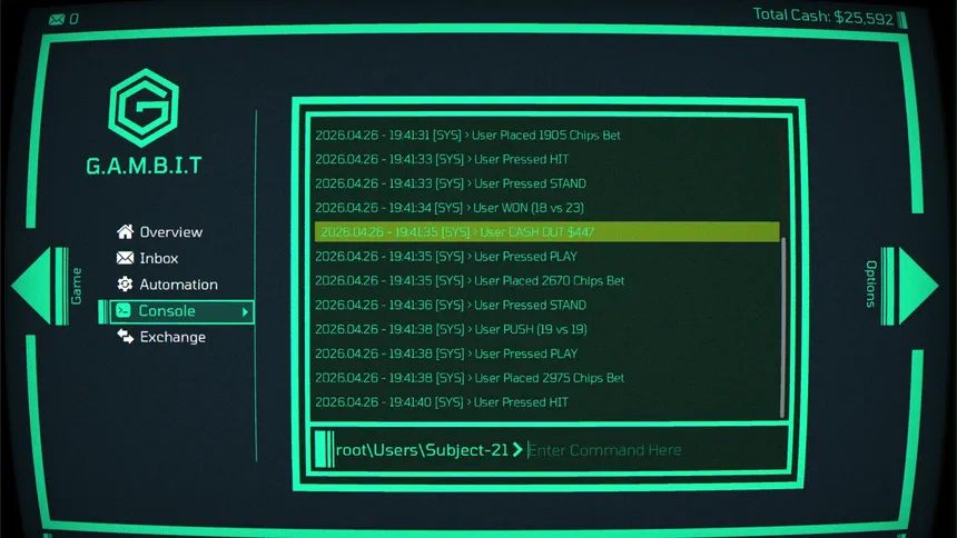 IdleJack is a Blackjack incremental idle game where you hack The House to settle your debt. Automate your blackjack strategy using complex scripts to calculate bust probabilities, track deck counts, and maximize profit-per-second. Manage multiple parallel terminals and watch your system print money.