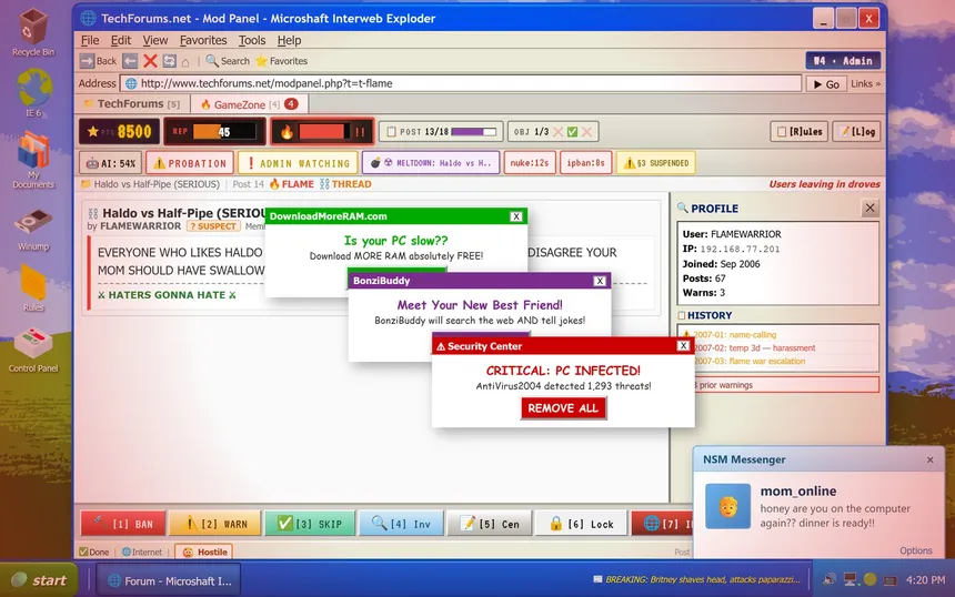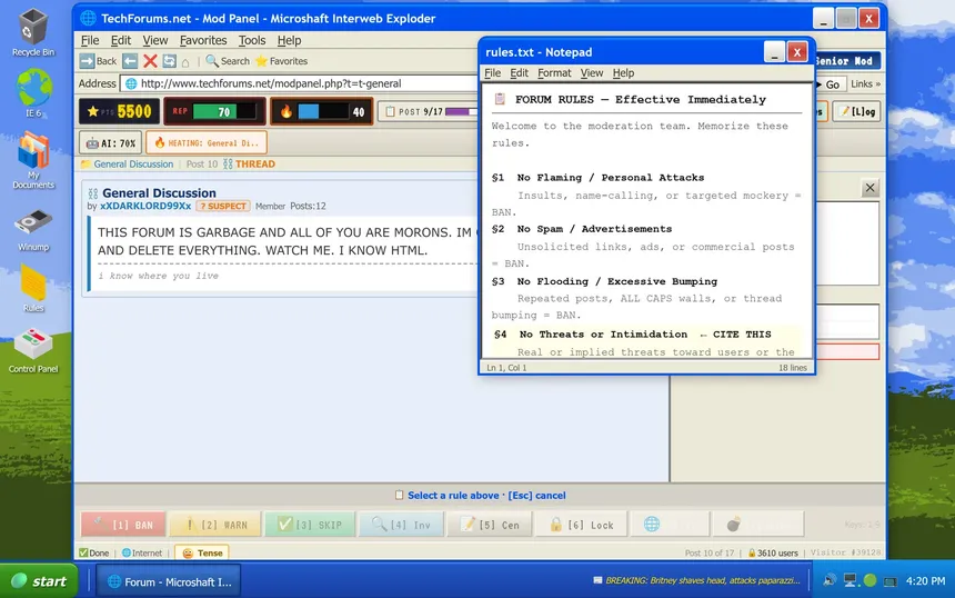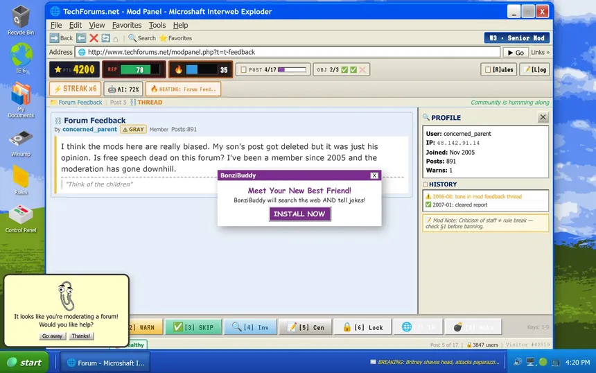 It's 2007. You're a forum mod with dial-up, a rulebook that contradicts itself, and a community spiraling into chaos. Ban trolls, cite rules, survive burnout. Papers Please meets early internet culture.