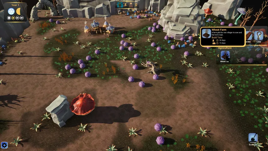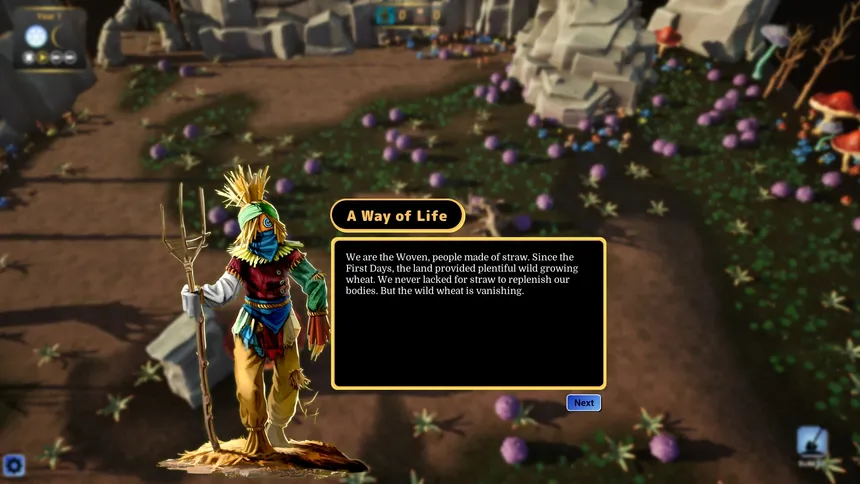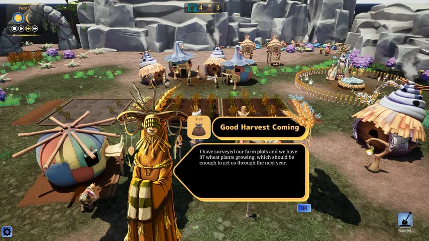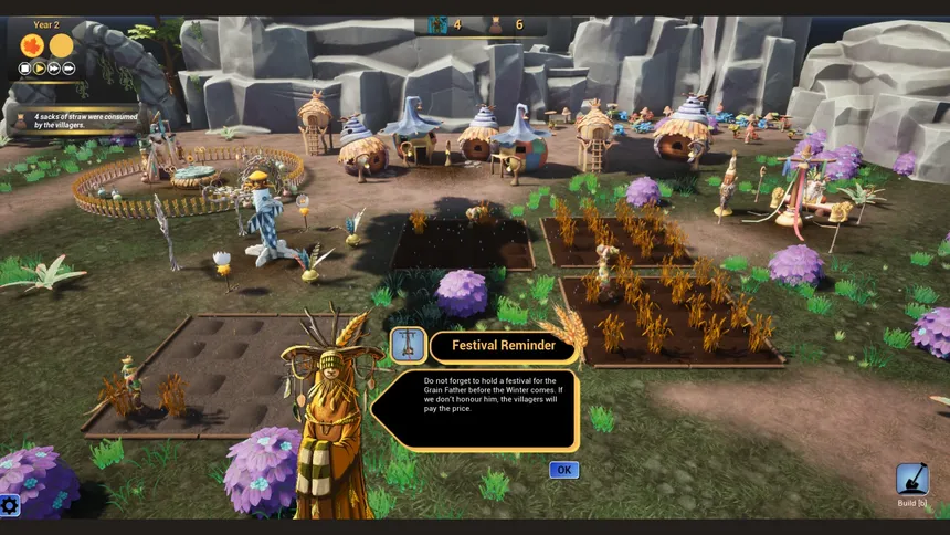 Wheat and Wrath is a fantasy city-builder about straw people transitioning from nomadic wheat gathering to a settled farming village with a patron god. To survive, players must sustain and grow the community, manage wrathful gods, trade for technology, and defend the village from raiders.