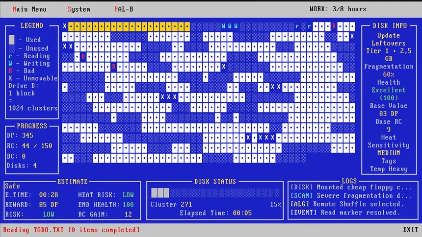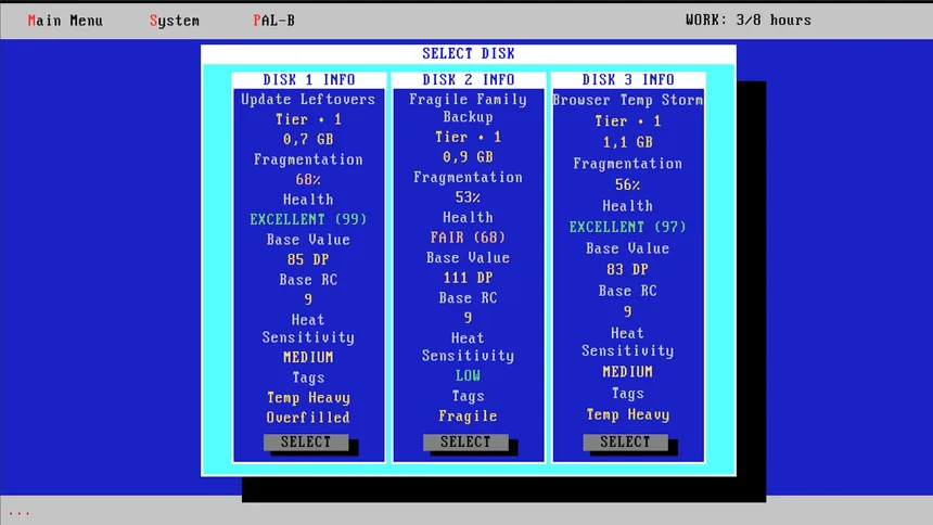 A retro incremental where you optimize messy disks, choose the right algorithm, manage heat and wear, make a living from each job, and reboot for permanent BIOS upgrades.