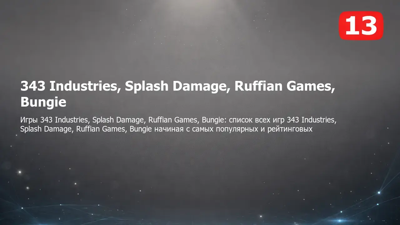 343 Industries, Splash Damage, Ruffian Games, Bungie — все игры разработчика 343 Industries, Splash Damage, Ruffian Games, Bungie представлены на данной странице, начиная с самых популярных и рейтинговых на PC (ПК), PS4, Xbox и других платформах. Всего 343 Industries, Splash Damage, Ruffian Games, Bungie выпустила 1 игру.