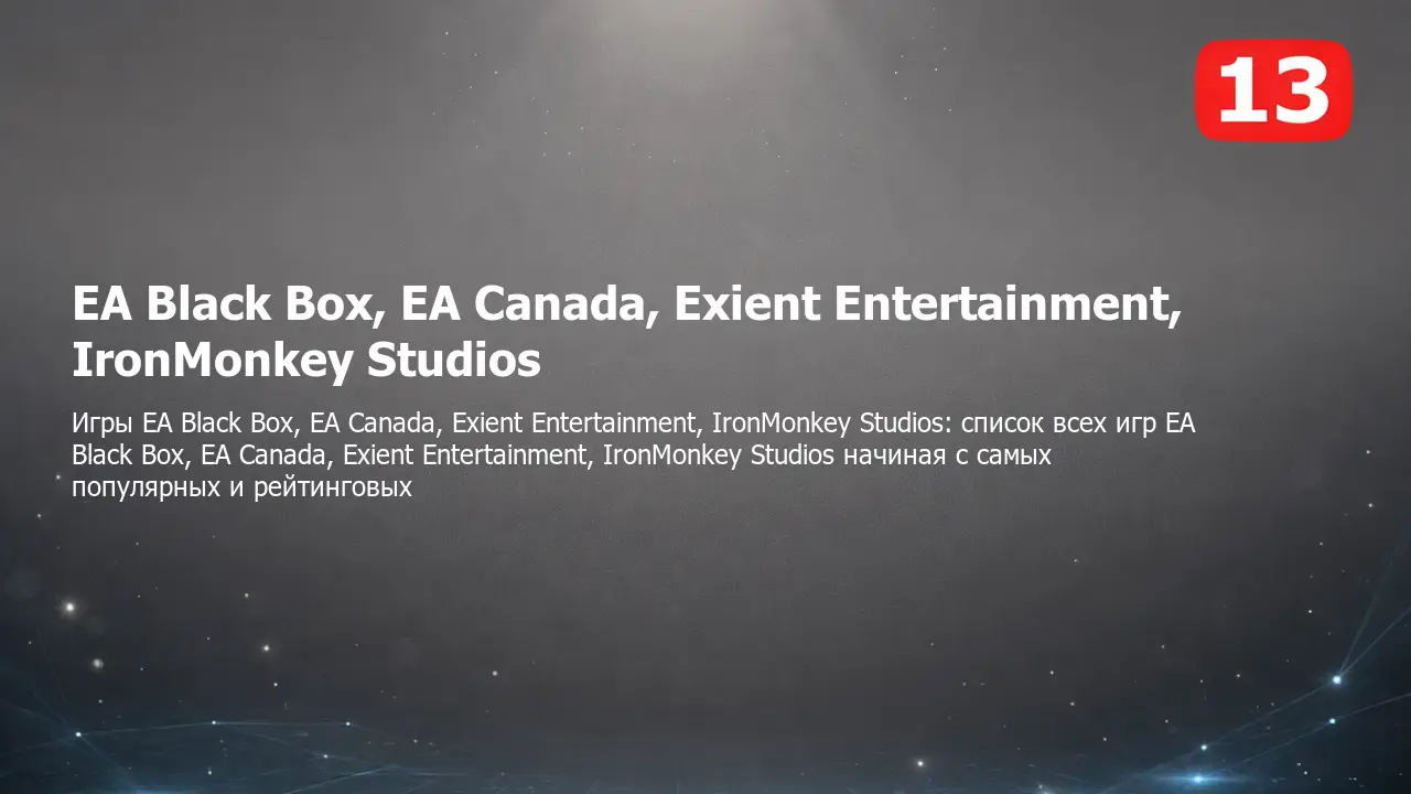 EA Black Box, EA Canada, Exient Entertainment, IronMonkey Studios — все игры разработчика EA Black Box, EA Canada, Exient Entertainment, IronMonkey Studios представлены на данной странице, начиная с самых популярных и рейтинговых на PC (ПК), PS4, Xbox и других платформах. Всего EA Black Box, EA Canada, Exient Entertainment, IronMonkey Studios выпустила 1 игру.