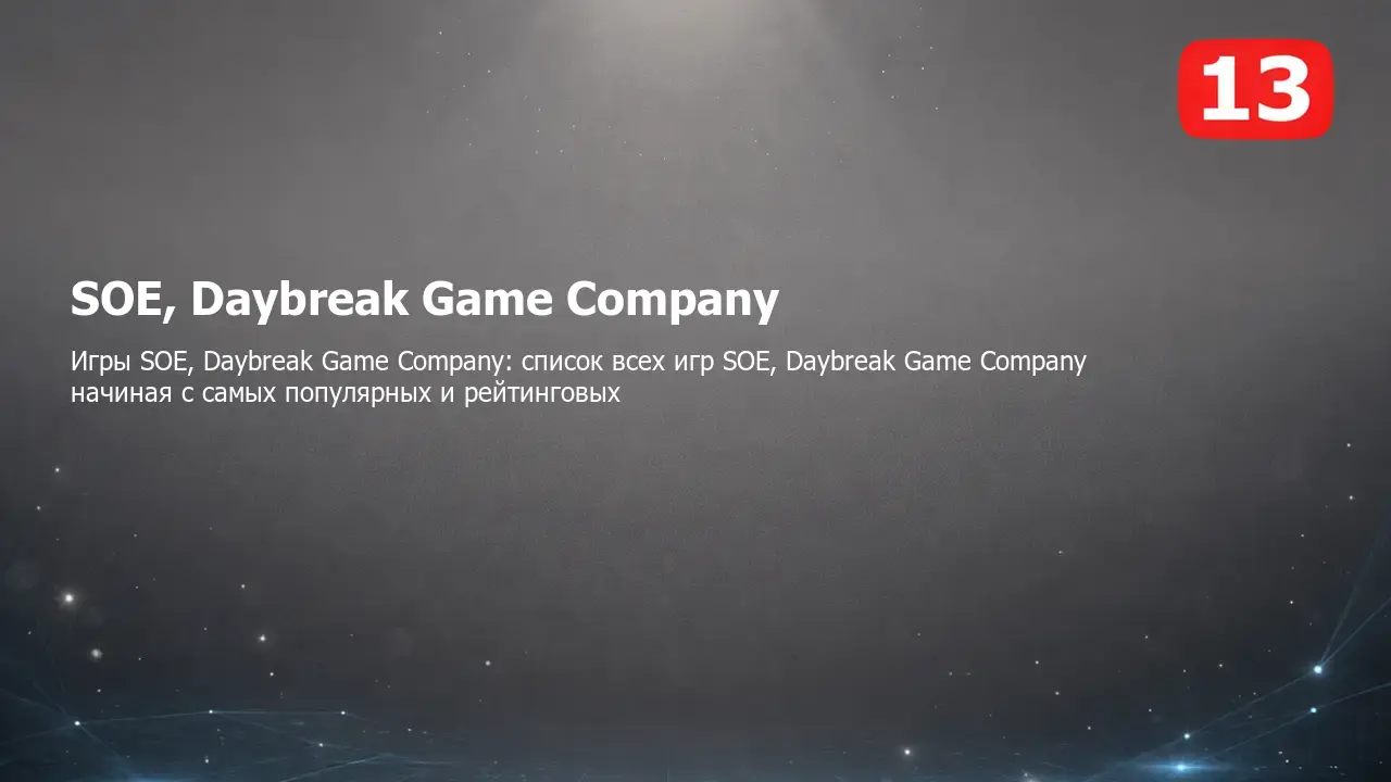 SOE, Daybreak Game Company — все игры разработчика SOE, Daybreak Game Company представлены на данной странице, начиная с самых популярных и рейтинговых на PC (ПК), PS4, Xbox и других платформах. Всего SOE, Daybreak Game Company выпустила 1 игру.