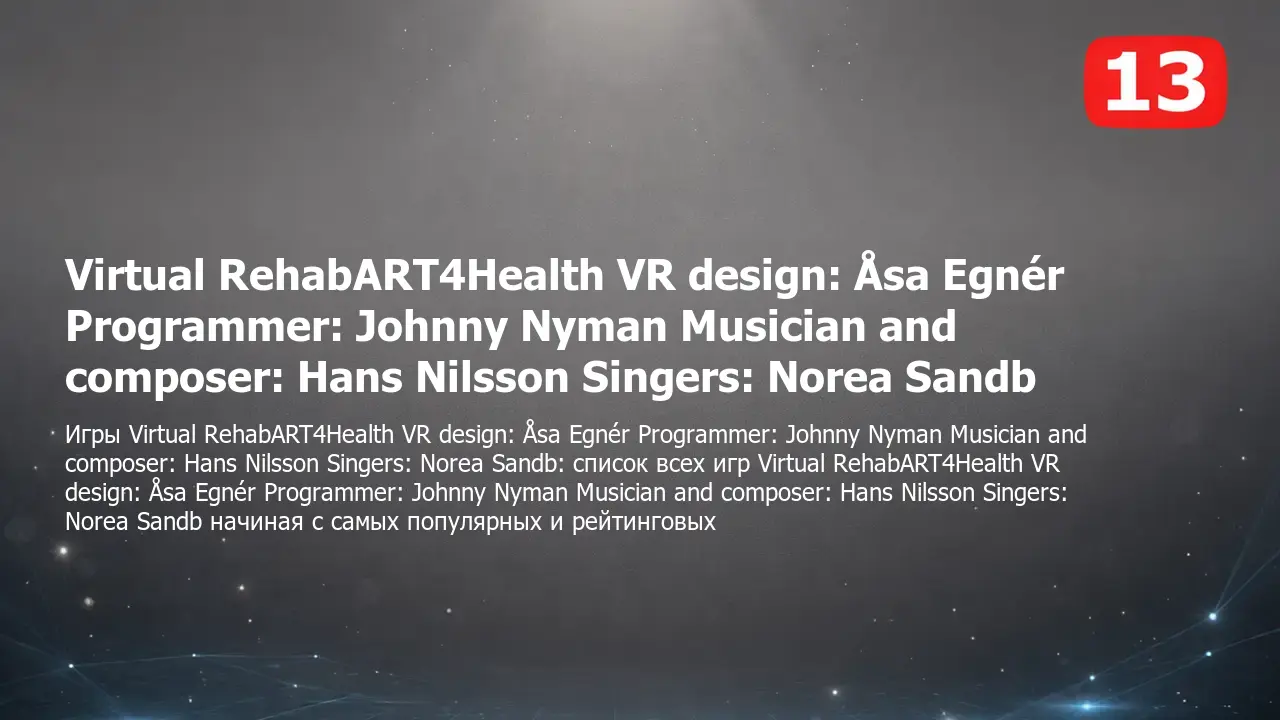Игры Virtual RehabART4Health VR design: Åsa Egnér Programmer: Johnny Nyman Musician and composer: Hans Nilsson Singers: Norea Sandb