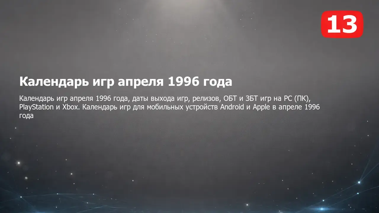 Календарь выхода игр апреля 1996 года на PC (ПК), PlayStation и Xbox, мобильных устройствах Android и Apple и других платформах. Самые ожидаемые и интересные компьютерные, консольные и мобильные игры, а также даты выхода, релизы, ОБТ, ЗБТ и другие тесты в календаре игр на апрель 1996 года.