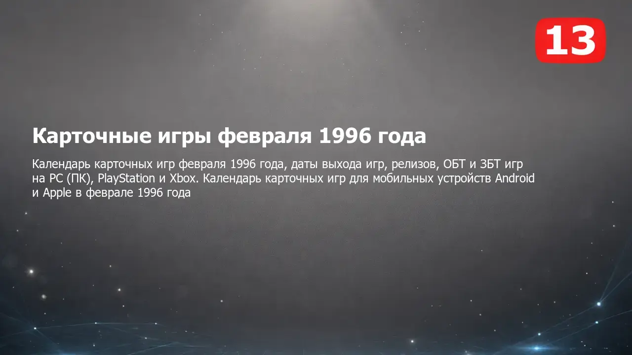 Календарь выхода карточных игр марта 1996 года на PC (ПК), PlayStation и Xbox, мобильных устройствах Android и Apple и других платформах. Самые ожидаемые и интересные компьютерные, консольные и мобильные карточные игры, а также даты выхода, релизы, ОБТ, ЗБТ и другие тесты в календаре карточных игр на март 1996 года.