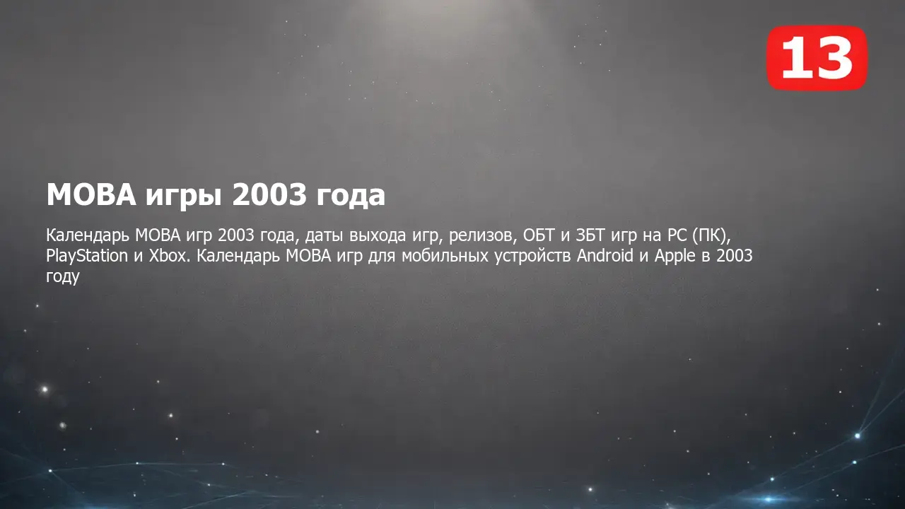 Календарь выхода MOBA игр 2003 года на PC (ПК), PlayStation и Xbox, мобильных устройствах Android и Apple и других платформах. Самые ожидаемые и интересные компьютерные, консольные и мобильные MOBA игры, а также даты выхода, релизы, ОБТ, ЗБТ и другие тесты в календаре MOBA игр на 2003 год.