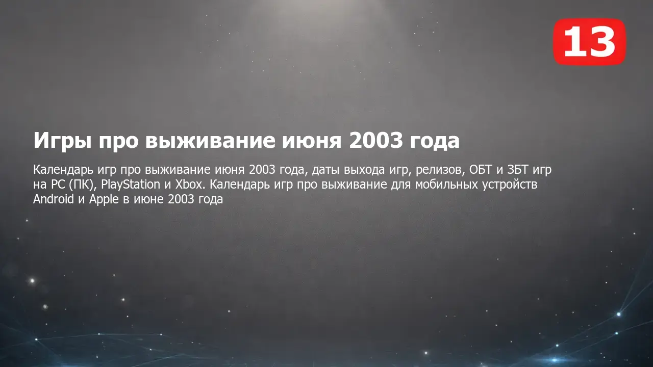 Календарь выхода игр про выживание июня 2003 года на PC (ПК), PlayStation и Xbox, мобильных устройствах Android и Apple и других платформах. Самые ожидаемые и интересные компьютерные, консольные и мобильные игры про выживание, а также даты выхода, релизы, ОБТ, ЗБТ и другие тесты в календаре игр про выживание на июнь 2003 года.