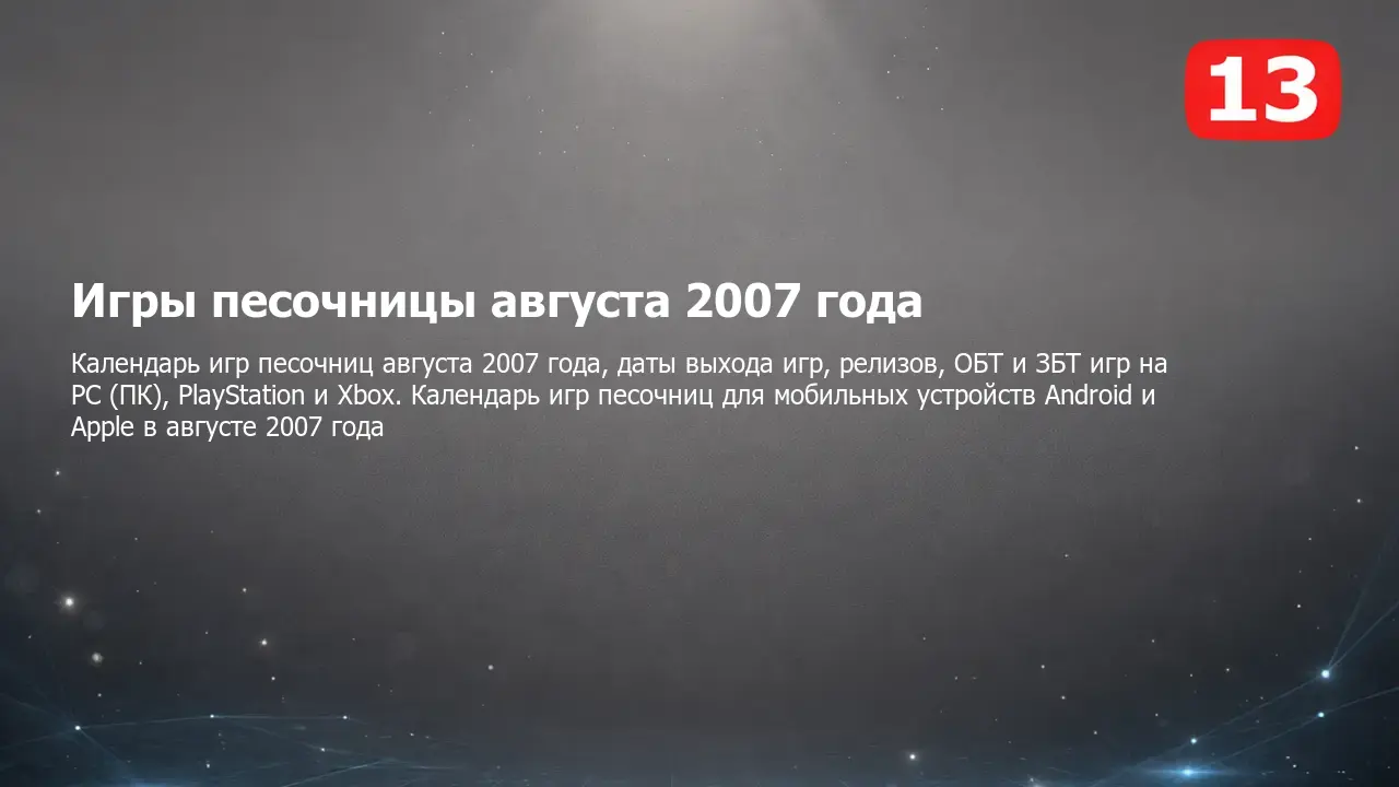 Календарь выхода игр песочниц августа 2007 года на PC (ПК), PlayStation и Xbox, мобильных устройствах Android и Apple и других платформах. Самые ожидаемые и интересные компьютерные, консольные и мобильные игры песочницы, а также даты выхода, релизы, ОБТ, ЗБТ и другие тесты в календаре игр песочниц на август 2007 года.