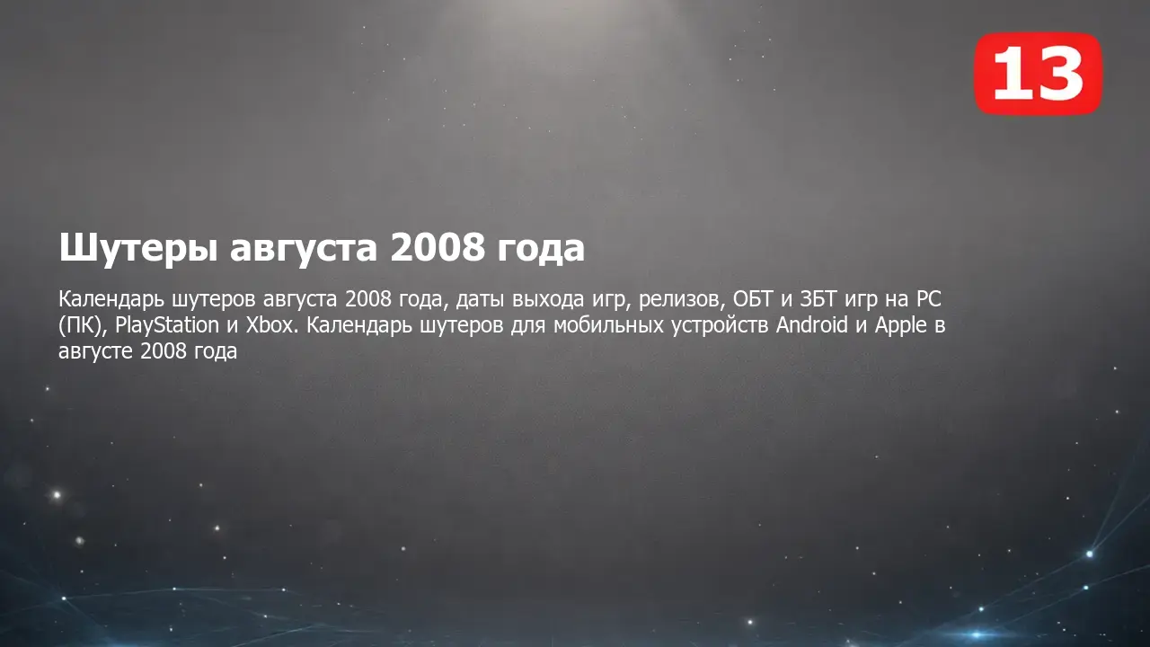 Календарь выхода шутеров августа 2008 года на PC (ПК), PlayStation и Xbox, мобильных устройствах Android и Apple и других платформах. Самые ожидаемые и интересные компьютерные, консольные и мобильные шутеры, а также даты выхода, релизы, ОБТ, ЗБТ и другие тесты в календаре шутеров на август 2008 года.