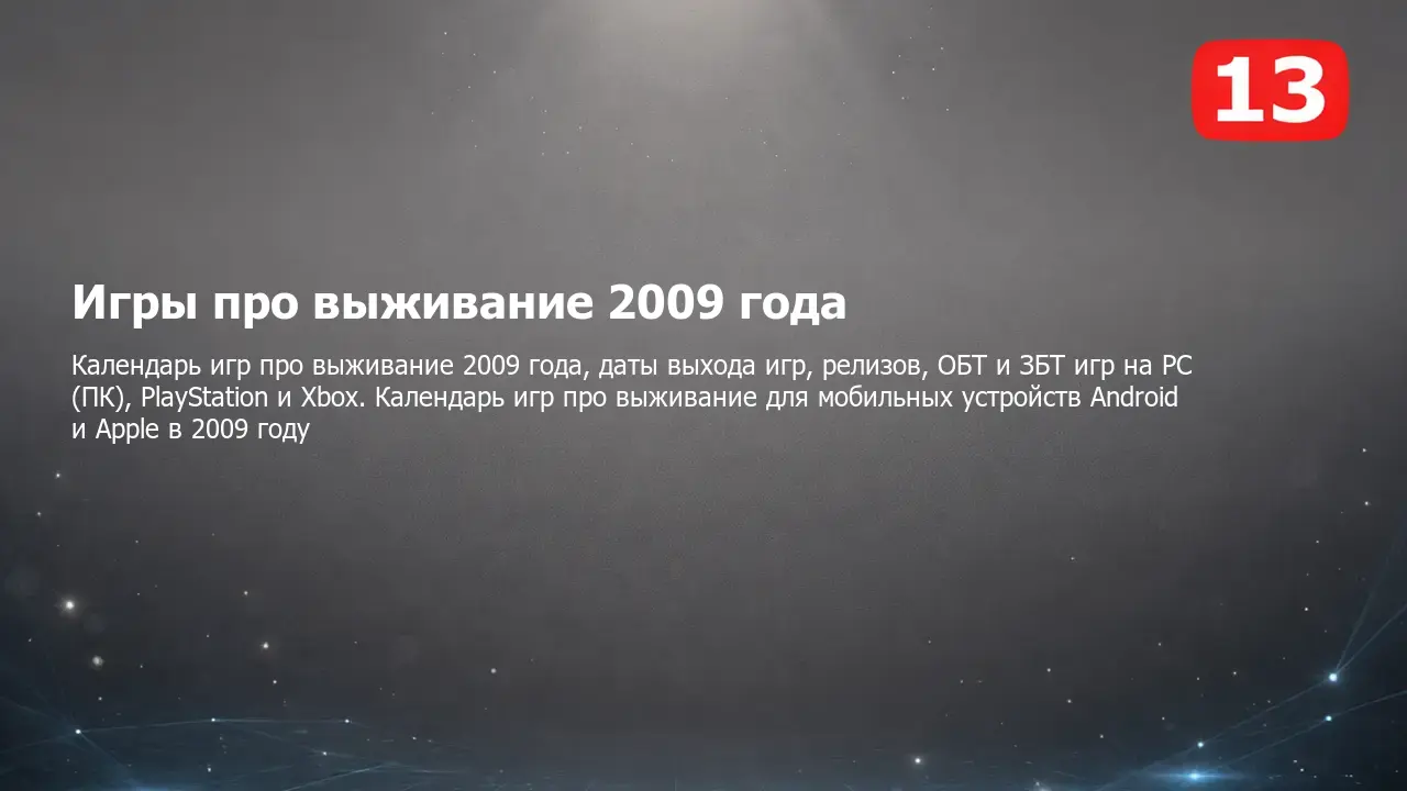 Календарь выхода игр про выживание 2009 года на PC (ПК), PlayStation и Xbox, мобильных устройствах Android и Apple и других платформах. Самые ожидаемые и интересные компьютерные, консольные и мобильные игры про выживание, а также даты выхода, релизы, ОБТ, ЗБТ и другие тесты в календаре игр про выживание на 2009 год.