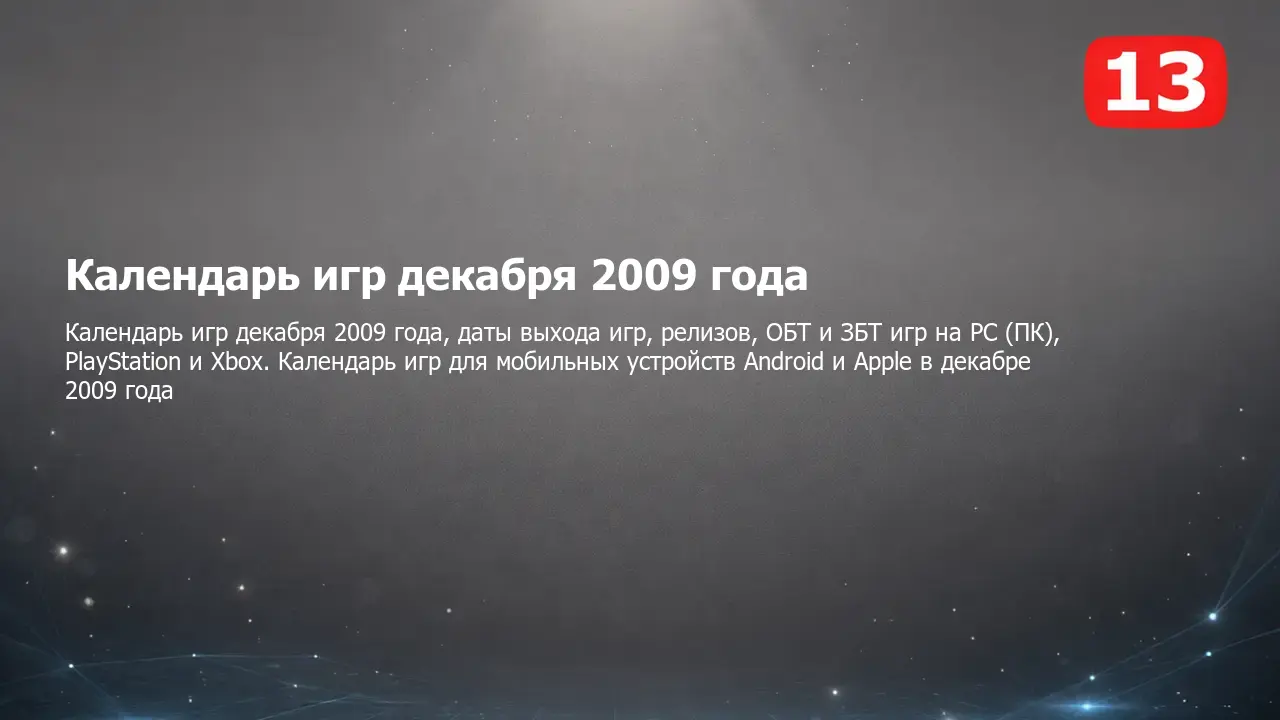 Календарь выхода игр декабря 2009 года на PC (ПК), PlayStation и Xbox, мобильных устройствах Android и Apple и других платформах. Самые ожидаемые и интересные компьютерные, консольные и мобильные игры, а также даты выхода, релизы, ОБТ, ЗБТ и другие тесты в календаре игр на декабрь 2009 года.