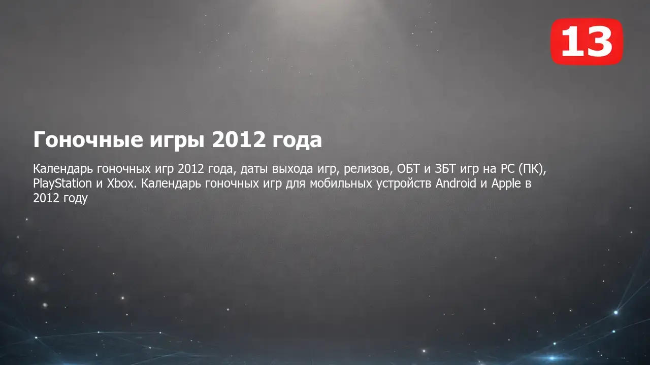 Календарь выхода гоночных игр 2012 года на PC (ПК), PlayStation и Xbox, мобильных устройствах Android и Apple и других платформах. Самые ожидаемые и интересные компьютерные, консольные и мобильные гоночные игры, а также даты выхода, релизы, ОБТ, ЗБТ и другие тесты в календаре гоночных игр на 2012 год.