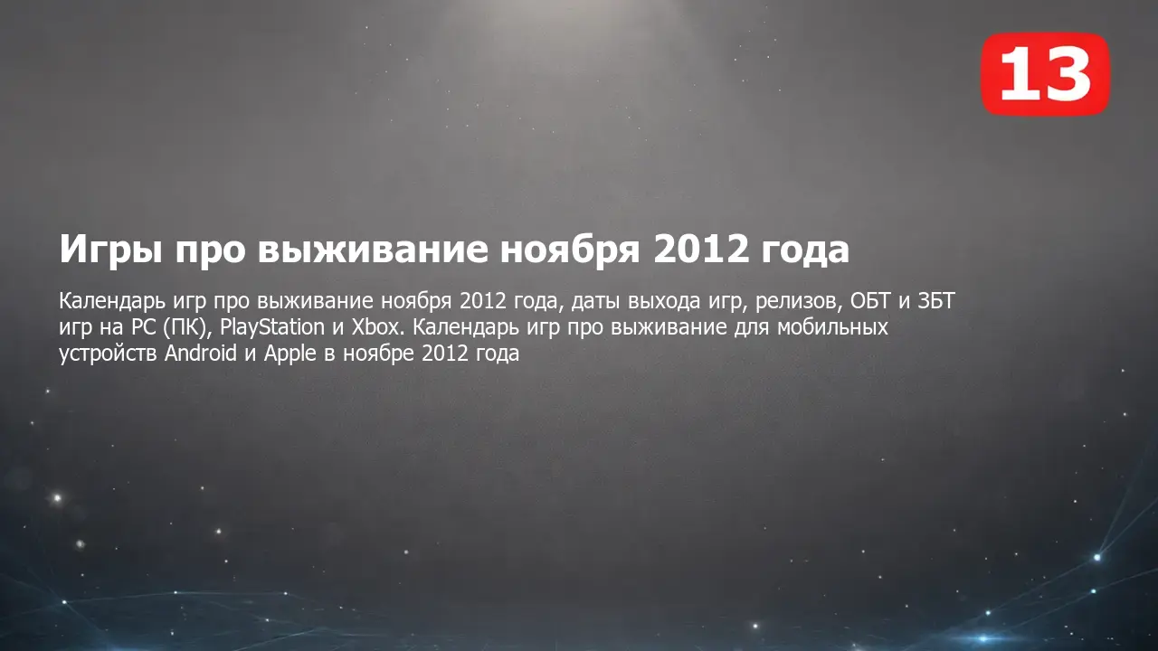Календарь выхода игр про выживание ноября 2012 года на PC (ПК), PlayStation и Xbox, мобильных устройствах Android и Apple и других платформах. Самые ожидаемые и интересные компьютерные, консольные и мобильные игры про выживание, а также даты выхода, релизы, ОБТ, ЗБТ и другие тесты в календаре игр про выживание на ноябрь 2012 года.