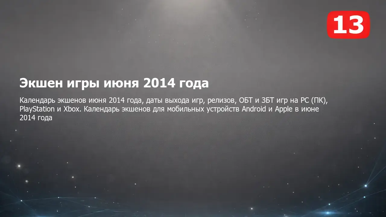 Календарь выхода экшенов июня 2014 года на PC (ПК), PlayStation и Xbox, мобильных устройствах Android и Apple и других платформах. Самые ожидаемые и интересные компьютерные, консольные и мобильные экшен игры, а также даты выхода, релизы, ОБТ, ЗБТ и другие тесты в календаре экшенов на июнь 2014 года.