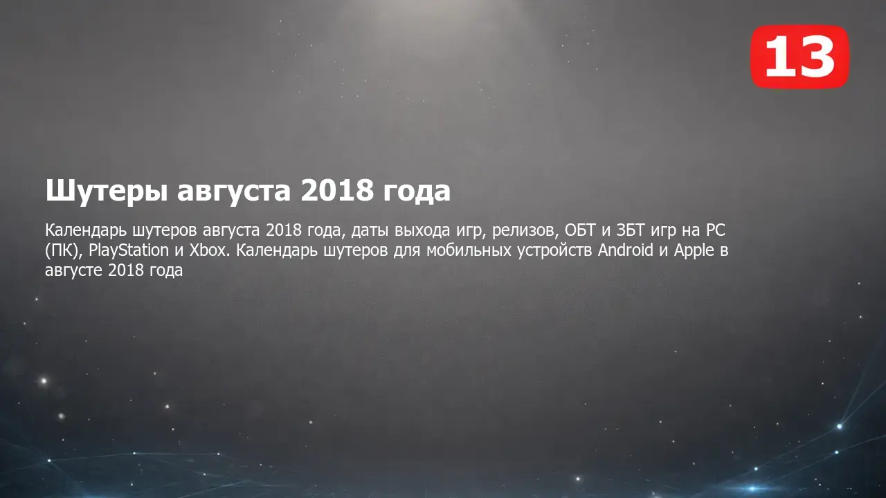 Календарь выхода шутеров августа 2018 года на PC (ПК), PlayStation и Xbox, мобильных устройствах Android и Apple и других платформах. Самые ожидаемые и интересные компьютерные, консольные и мобильные шутеры, а также даты выхода, релизы, ОБТ, ЗБТ и другие тесты в календаре шутеров на август 2018 года.