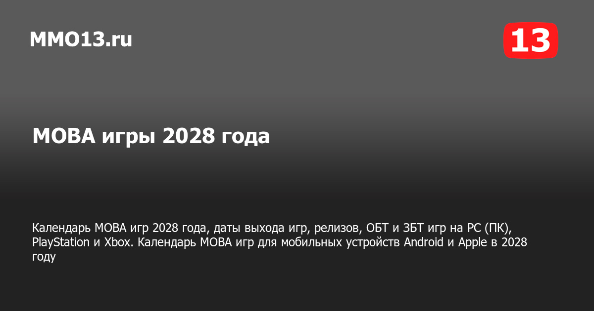Календарь выхода MOBA игр 2028 года на PC (ПК), PlayStation и Xbox, мобильных устройствах Android и Apple и других платформах. Самые ожидаемые и интересные компьютерные, консольные и мобильные MOBA игры, а также даты выхода, релизы, ОБТ, ЗБТ и другие тесты в календаре MOBA игр на 2028 год.
