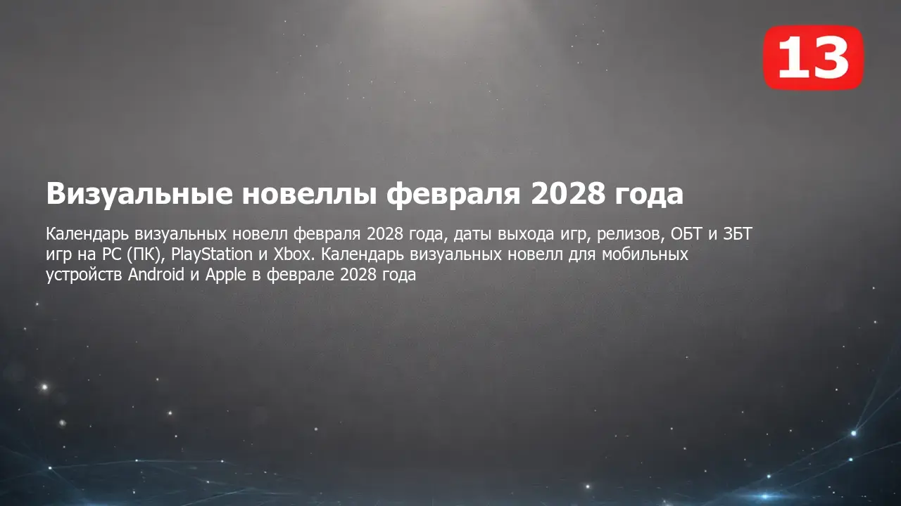 Календарь выхода визуальных новелл 2028 года на PC (ПК), PlayStation и Xbox, мобильных устройствах Android и Apple и других платформах. Самые ожидаемые и интересные компьютерные, консольные и мобильные визуальные новеллы, а также даты выхода, релизы, ОБТ, ЗБТ и другие тесты в календаре визуальных новелл на 2028 год.