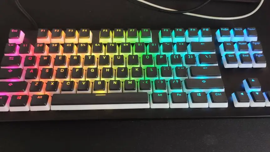 Стабилизаторы больших кнопок на обеих клавиатурах среднего качества. После легкой смазки Permatex’ом стали значительно лучше. Стоит отметить, что каждый свитч Razer обладает собственным стабилизатором, но заметной пользы от этого мы не увидели — скорее, наоборот, получили дополнительный источник шума. Завершая разговор о переключателях, стоит сказать, что они совместимы кейкапами Cherry-типа. Кроме того, Huntsman TE используется стандартный нижний ряд, что делает подбор кастомных колпачков еще проще. На прилагаемом фото — Razer Huntsman TE с двухцветными кейкапами Pudding.