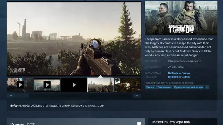 На площадке Steam внезапно появилась страница хардкорного шутера Escape From Tarkov. Однако не спешите радоваться! Это всего лишь скам-проект, который мошенники пытаются продать за 1500 рублей. После покупки вы получите простенькую двухмерную игру, явно не похожую на ту, что показана на скриншотах.