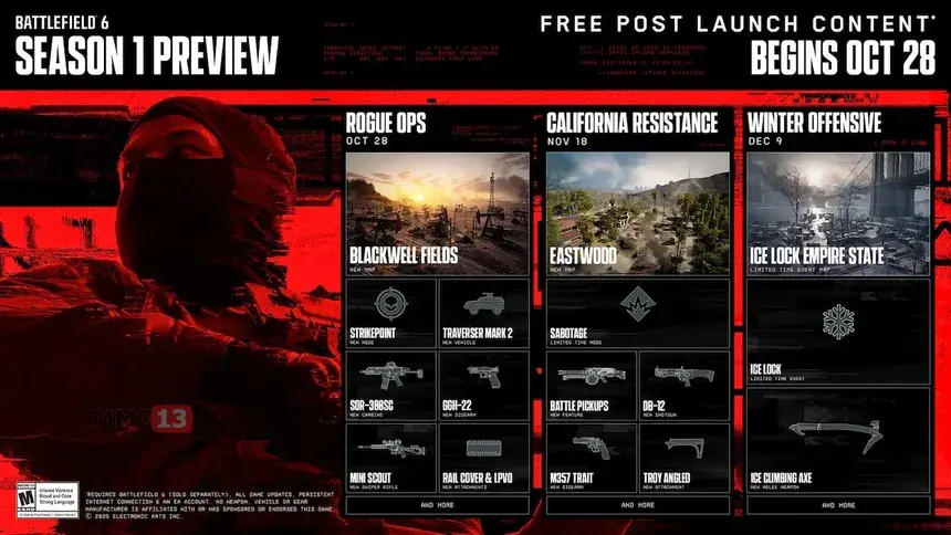 Ранее разработчики представили план развития Battlefield 6 до конца года. Так, первый сезон начнется 28 октября 2025 года и принесет с собой новую карту Blackwell Fields. Карта Eastwood станет доступна 18 ноября, а 9 декабре будет введена ивентовая зимняя карта Winter Offencive. Конечно, помимо новых локаций, команда будет добавлять и прочий контент, в том числе режимы и оружие.