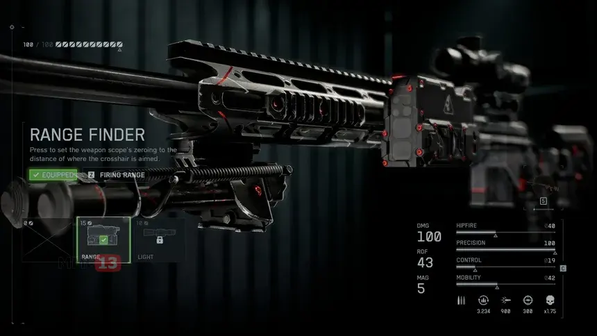 Дальномер — краеугольный камень этой снайперской раскладки. Если вы пристреливаете прицел с установленным дальномером, он автоматически выставит поправку на дистанцию до точки, куда направлено ваше перекрестие. Таким образом, вам не придется беспокоиться о падении пули или рассчитывать дальность на лету.