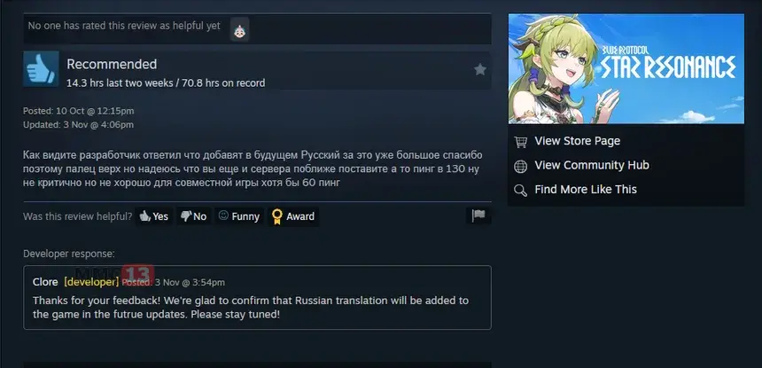 «Спасибо за ваш отзыв! Мы рады подтвердить, что русский перевод будет добавлен в игру в будущих обновлениях. Следите за новостями!»