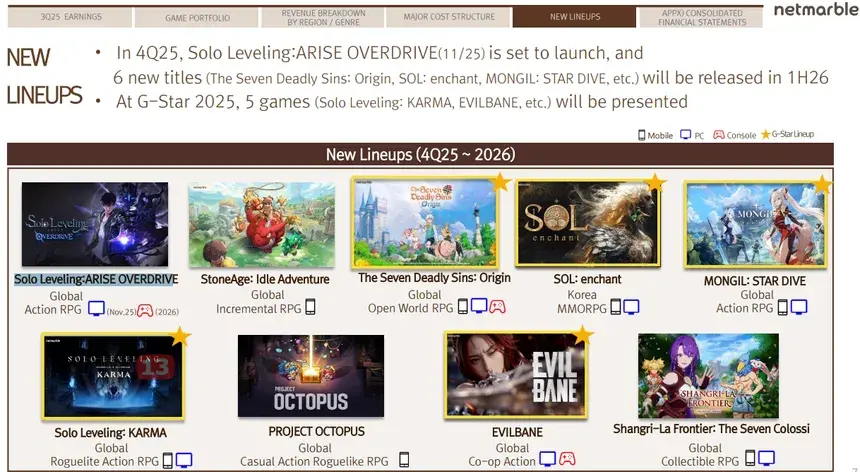 Об этом стало известно в рамках финансового отчета за третий квартал 2025 года. По словам Ким Бён-Гю, генерального директора Netmarble, это связанно со степенью готовности игр и текущей рыночной ситуацией. На данный момент планируется, что два проекта, из перенесенных ранее, выйдут в первом квартале 2026 года, а два несколько позже.