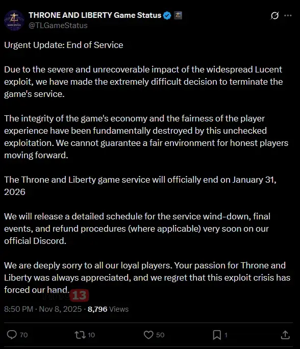 Издатель через несколько часов ограничил работу аукциона, а ещё примерно через час и вовсе отключил игровые серверы на техническое обслуживание. Стоит отметить, что Amazon Games пока никак не комментирует ситуацию, используя лишь формулировку «выявленная проблема».
