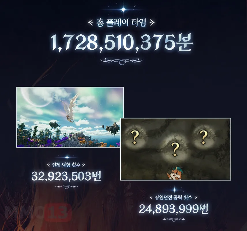 Всего игроки потратили 1 728 510 375 минут, что эквивалентно примерно 3 288 годам. За это время было пройдено почти 34 миллиона «Экспедиций» и 25 миллионов подземелий. А больше всего не повезло боссу Kromed, которого убили 2 322 736 раз.