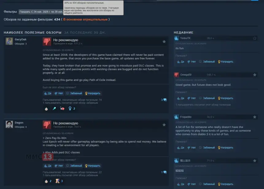 Новость о введении в игру платных классов вызвала бурные обсуждения среди комьюнити экшен-RPG Last Epoch. Часть игроков с пониманием отнеслась к данной новости, но некоторые остались крайне недовольны и отправились выражать своё недовольство в Steam. За несколько дней в общей сложности было оставлено 434 обзора, из которых лишь 30% — положительные.