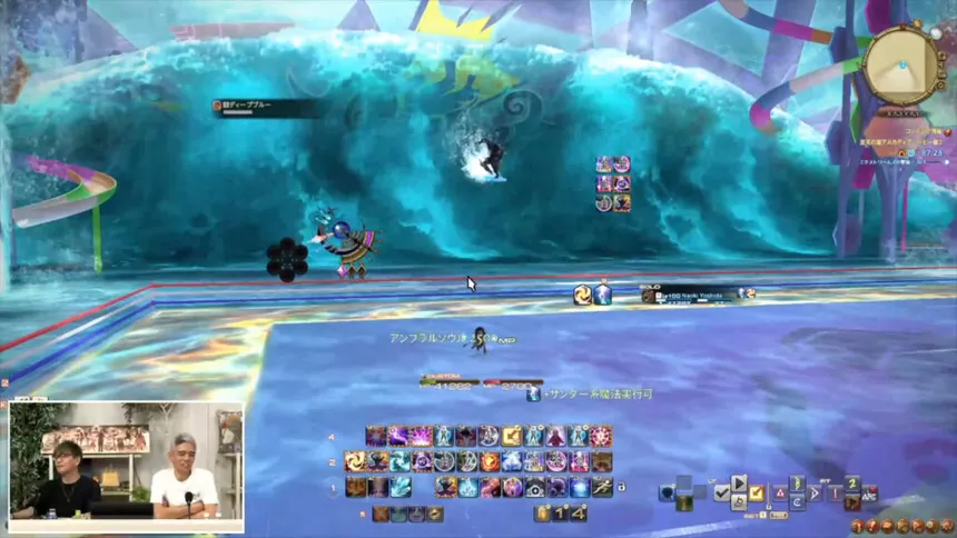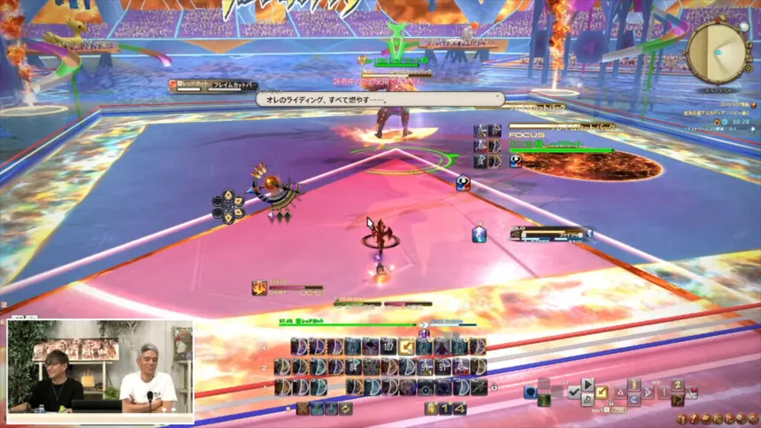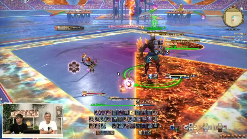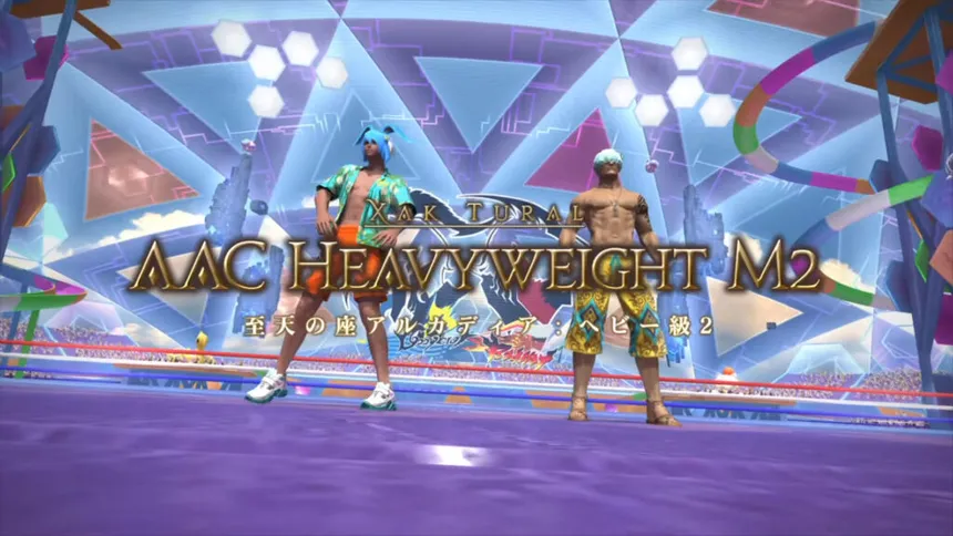 Ёсида продемонстрировал сражение AAC Heavyweight M2 — второй этаж третьего и финального уровня рейда, который появится в патче 7.4. В нем мы видим двух противников, которые сменяют друг друга на ринге и используют механики, превращающие арену в лаву или накрывающие ее огромной волной.