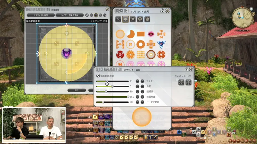 Объекты на доске для удобства имеют иконки профессий. В другой вкладке отображаются различные игровые механики. Ёсида перетаскивал механики на доску, размещал и настраивал их. Он показал изменение размера, угла поворота, прозрачности и других параметров через подменю.