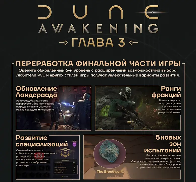 Funcom представила для MMO-песочницы Dune: Awakening крупное бесплатное обновление «Глава 3», которое выйдет в начале 2026 года. Одновременно с ним станет доступно платное дополнение «Рейдеры Изломанных земель», входящее в сезонный абонемент и доступное для отдельной покупки за $9,99.