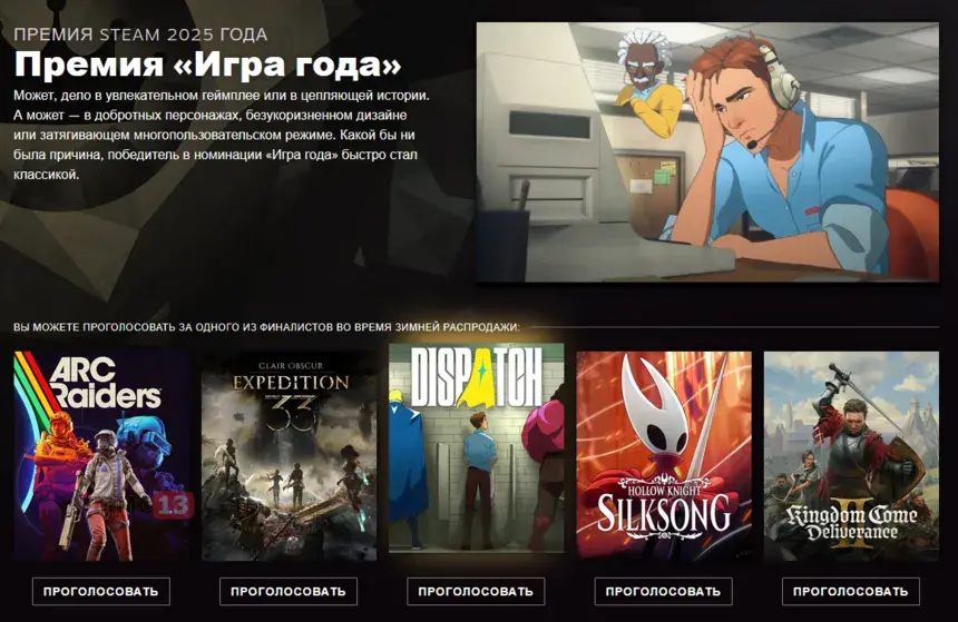 В рамках премии Steam пользователям предлагается проголосовать в одиннадцати номинациях. А за главный приз в лице «Игра года» борятся пять самых хайповых игр 2025 года: ARC Raiders, Clair Obscur: Expedition 33, Dispatch, Hollow Knight: Silksong и Kingdom Come: Deliverance II.