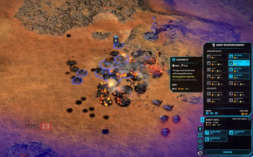 По мере уничтожения техники армия способна автоматически восполнять потери, если включена соответствующая опция. Новые юниты ставятся в очередь производства и самостоятельно направляются к точке сбора, где в данный момент находится армия.