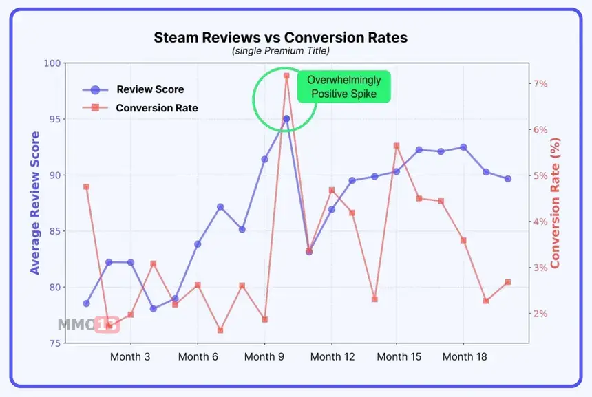 Gamesight приводит пример определенного проекта, за которым велось наблюдение в течение двадцати одного месяца (название не раскрывается, но, вероятно, речь идет про No Man's Sky). Первое время игра удерживала конверсию на уровне 2–3%, однако после выпуска крупного обновления с функциями, о которых долго просило сообщество, рейтинг поднялся до отметки «Крайне положительные». Это привело к мгновенному скачку конверсии почти до 7%. Примечательно, что даже после завершения периода ажиотажа базовый показатель закрепился на уровне 3,8%, а это значительно выше первоначальных значений. Аналитики связывают это с тем, что качественные изменения продукта создают долгосрочный эффект сарафанного радио и делают игру более привлекательной для инфлюенсеров.