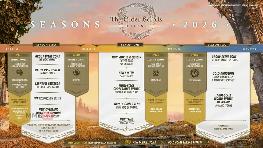 В планах студии на будущие сезоны значатся возвращение Шеогората, новая сюжетная линия Гильдии воров, одиночные подземелья и морские события. Чтобы компенсировать изменения для подписчиков ESO Plus, разработчики пообещали расширить список бонусов, а все владельцы игры в марте получат бесплатный доступ к DLC «Гильдия воров» и «Темное братство».