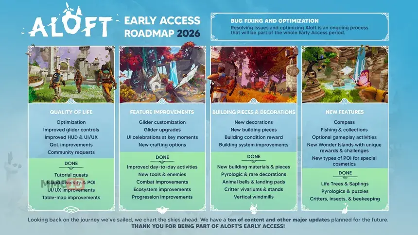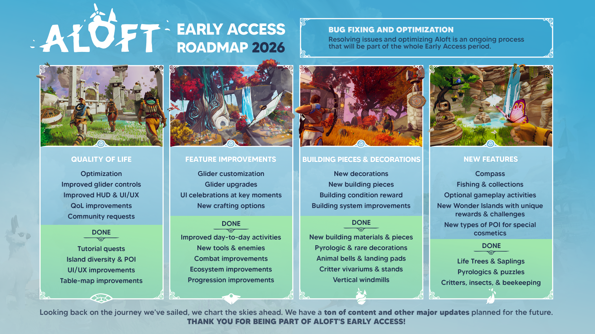 Следующим важным этапом для Aloft станет выход обновления Gliders & Gales, запланированный на 12 февраля 2026 года. Основной акцент в нем будет сделан на расширении возможностей полетов. Игроки получат переработанную механику планеров, систему испытаний в воздухе и новые инструменты для персонализации своего летного снаряжения. По заверениям авторов, этот патч должен углубить взаимодействие с воздушными потоками, которые являются ключевым элементом игрового мира.