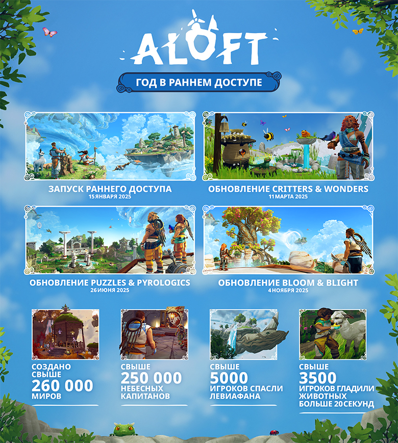 Студия Astrolabe Interactive подвела итоги первого года пребывания симулятора выживания Aloft в раннем доступе и поделились планами развития проекта на 2026 год. За прошедший период проект прошел путь от базовой концепции до комплексной экосистемы, получив три крупных контентных патча, которые привнесли в игру уникальные острова чудес, логические цепи на основе янтарного камня и разветвленное древо технологий.